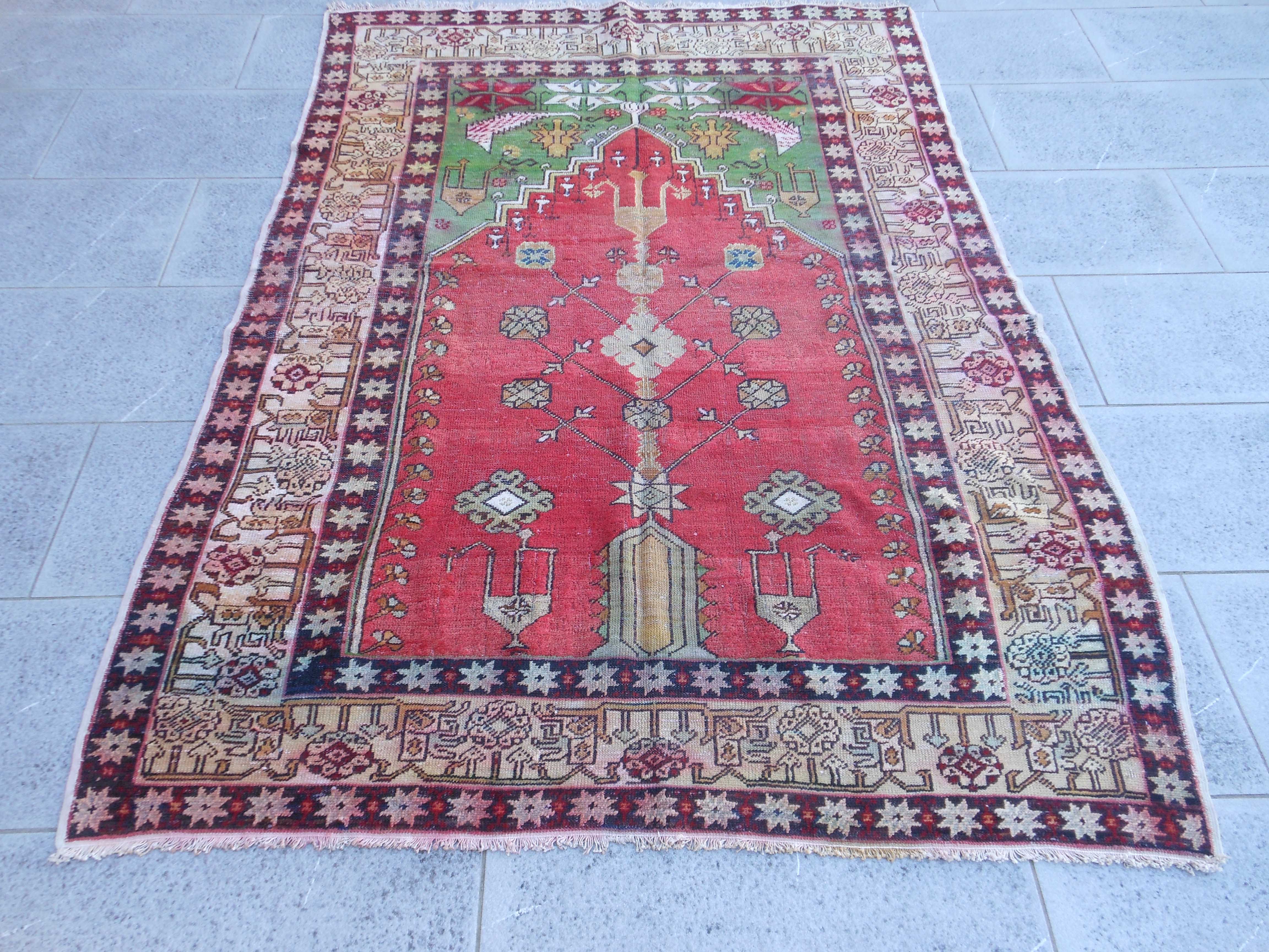 GHIORDES – TAPPETO – TURCHIA – ANTICO – 191 X 135 cm – codice.0182 Preghiera di Ghiordes di inzio secolo 20°. Presenta una anomalia nel parallelismo dei lati ed inoltre… GHIORDES – TAPPETO – TURCHIA – ANTICO – 191 X 135 cm – codice.0182